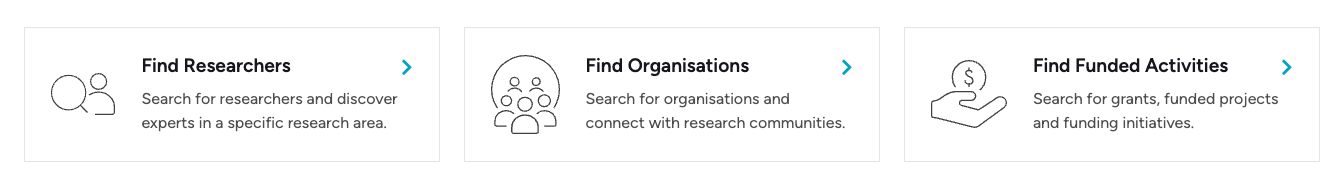The search result page defaults to displaying records under the 'Researcher' tab. You can use the tab menu located on top of the Search Bar to modify this setting. his menu lists three available record types as options. electing any of these options before searching will ensure that the search result page presents the corresponding tab.